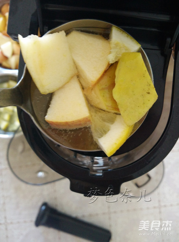 3. 原汁機(jī)裝細(xì)網(wǎng),先放一些蘋果進(jìn)機(jī)里,再勺水果酒混合,一邊榨一邊勺