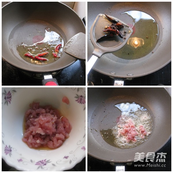 2. 另起一鍋,倒入適量的油燒熱后加入花椒和紅尖椒爆香,這樣花椒辣油就做好了,然后撈出花椒和辣椒不用,豬肉切小丁,加入1勺料酒里面拌勻,然后倒入剛才的油鍋里面,用筷子劃散開(kāi)