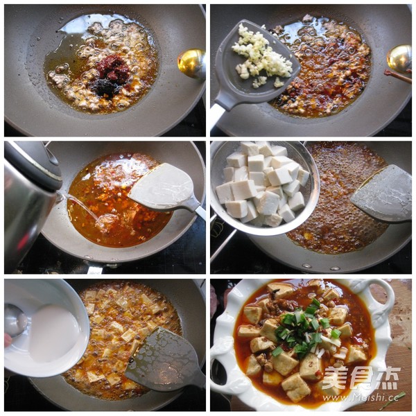 3. 肉顏色變白后,加入一勺豆豉醬和一勺豆瓣醬,煸出紅油后,加入姜蒜末里面炒香,接著倒入1碗水里面煮開(kāi),然后把之前煮好的豆腐瀝出來(lái),倒進(jìn)鍋里面。蓋上蓋子燜煮6分鐘左右,煮好后,加入1小勺糖提味。再加入水淀粉里,最后盛出來(lái),撒上青蒜末和花椒碎就完成了